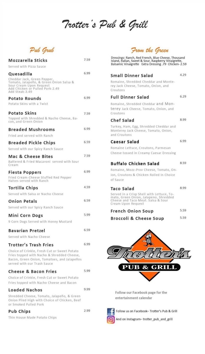 At the heart of their menu are the signature Trotter Burgers, featuring a 1/2 lb. charbroiled beef patty on a warm brioche bun, customizable to your preferred doneness. Another favorite is the 6 oz. Ribeye Sandwich, cooked to perfection with options for added toppings. For lighter bites, their Buffalo Chicken Wrap and tantalizing Mozzarella Sticks promise satisfaction.